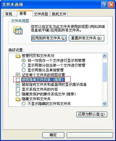 1、控制面板—>文件夹选项—>查看 关闭“使用简单文件共享(推荐)”