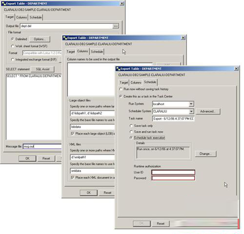 除了从 DB2 命令行执行 EXPORT 命令外,还可以使用 Control Center 进行导出。从 Control Center 这个工具中,可以指定导出实用程序支持的所有选项和子句,例如大型对象和 XML 数据。如下图所示,Schedule 选项卡允许您创建一个任务,并调度在给定时间运行的导出。