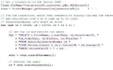 下面的Java代码片断提出一系列非参数特设查询到AdventureWorks数据库中,以此来获得用户销售订单数据。它通过循环,从AdventureWorks SalesOrderHeader表中前20张订单中获得信息。