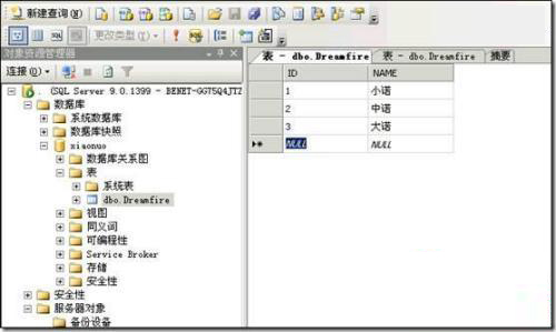 1、 首先创建一个数据库,并在数据库里创建一张表Dreamfire做测试用。
