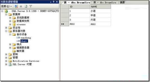 2、 其次创建两个备份设备(备份数据存放的地方),一个存放完整备份的数据,一个存放差异备份的数据。做一次完整备份+差异备份,假如完整备份在1点做完整备份,2点做差异备份。