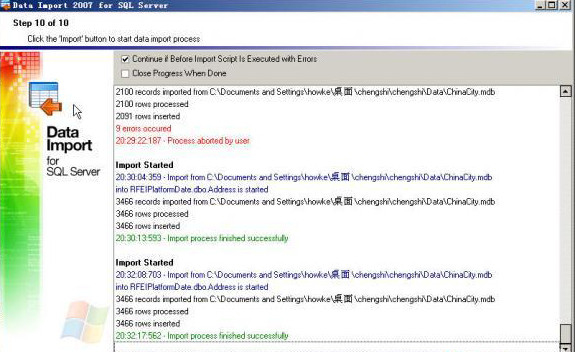 我的服务器SQL Server Express 版本的,附带的Express版本的SQL管理器并没有导入其他数据库数据的功能。大家可以下载一个Data Import 2007 for Sql Server,它是EMS for Sql Server其中的一个小程序。但是EMS for Sql Server注册版很难找到,但是Data Import却让我找到了它的破解版。他们的区别是:未注册的版本只能导入100条记录(全国城市数据库有3000多条记录)。