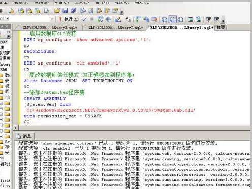 1、创建CLR程序集如果失败,需要开启CLR功能,默认数据库是不允许创建CLR的,还有就是更改数据库的信任模式,代码如下:
