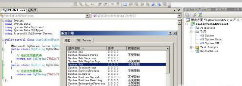 四、由于我们在代码中要用到 System.Web.HttpUtility.UrlDecode 方法,而默认SQL Project工程下是找不到它的System.Web引用的,所以需要把System.Web引用添加在SQL 2005 中,它告诉我们如果我们在SQL 2005中找不到相关类库的引用,必须在SQL 2005 中先引用它的父程序集。此例如下图: