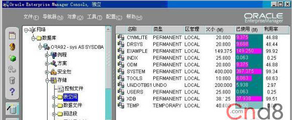 使用oracle enterprise manager console工具,这是oracle的客户端工具,当安装oracle服务器或客户端时会自动安装此工具,在windows操作系统上完成oracle安装后,通过下面的方法登录该工具:开始菜单——程序——Oracle-OraHome92——Enterprise Manager Console(单击)——oracle enterprise manager console登录——选择‘独立启动’单选框——‘确定’ —— ‘oracle enterprise manager console,独立’ ——选择要登录的‘实例名’ ——弹出‘数据库连接信息’ ——输入’用户名/口令’ (一般使用sys用户),’连接身份’选择选择SYSDBA——‘确定’,这时已经成功登录该工具,选择‘存储’ ——表空间,会看到如下的界面,该界面显示了表空间名称,表空间类型,区管理类型,以”兆”为单位的表空间大小,已使用的表空间大小及表空间利用率。