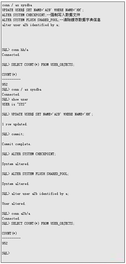 一般修改用户名大多使用导出用户a再导入用户b来实现用户名的换名假如在测试库上你可以用下面的方法来简单实现这样就不用导出了