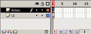 2) 通过 Insert -> Layer 菜单,添加一个层,并把现有的两个层名字分别修改为UI 和 Action ,如图一。其中,Action层是我们统一放程序代码的地方,Flash是一个编程极其灵活的开发工具,可以放置代码的地方非常多,如MovieClip内部、各个祯、按钮等内部都可以放置程序代码(关于代码放置的详细阐述,请参见作者的另一篇文章“Flash 编程规范”),假如MovieClip嵌套过深的话,这将增加以后维护程序的难度。