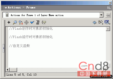 3) 选中 Action层,打开Action面板,切换到专家模式,加入以下注释,如图二: