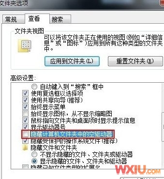 随后,在打开的“文件夹选项”对话框中切换到“查看”选项卡,拉动右侧滑动块(到中间位置),取消Windows7系统默认勾选的“隐藏计算机文件夹中的空驱动器”即可。