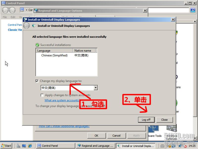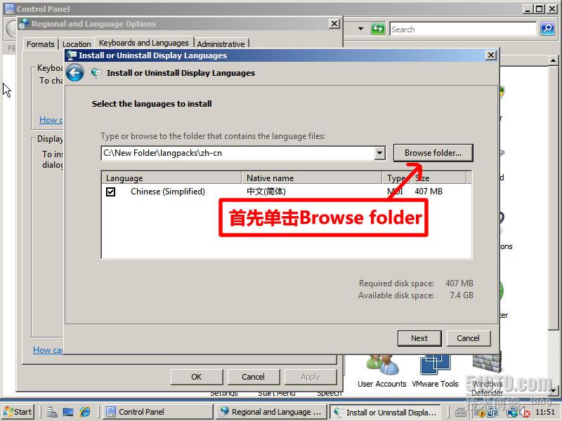 首先在弹出的Install Languages对话框中单击Browse folder按钮,其次选择下载的语言包解压后的Langpacks目录里的子目录zh-cn(请注意这里只需要选择所在目录就可以了),然后单击其对话框内的Next按钮,如图六所示。首先在弹出新的对话框中选择I accept the license terms.其次单击其对话框内的Next按钮,如图七所示。最后在弹出的新对话框中单击Install按钮,如图八所示。接下来就开始安装了,等待安装好后勾选新弹出的对话框里的Change my display language to:选项,最后单击Log off重启后就大功告成了,如图九所示。