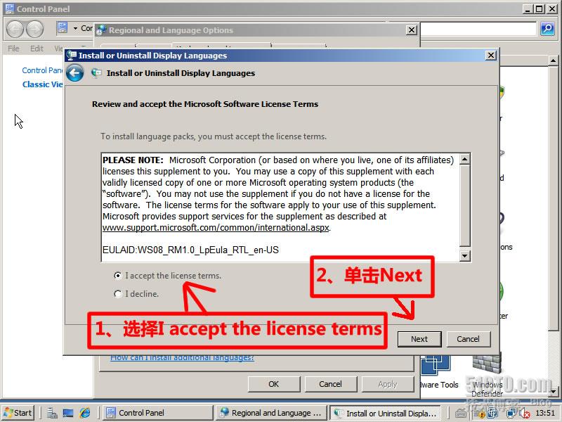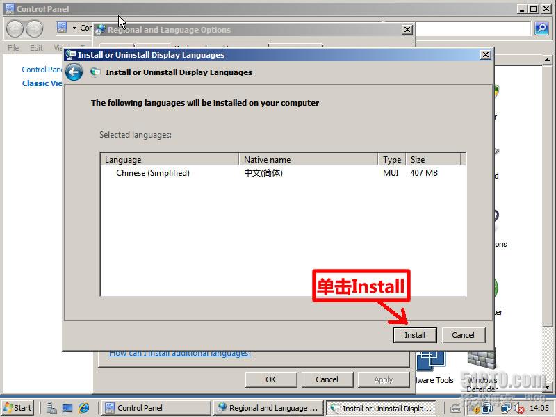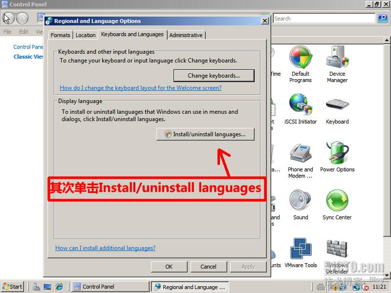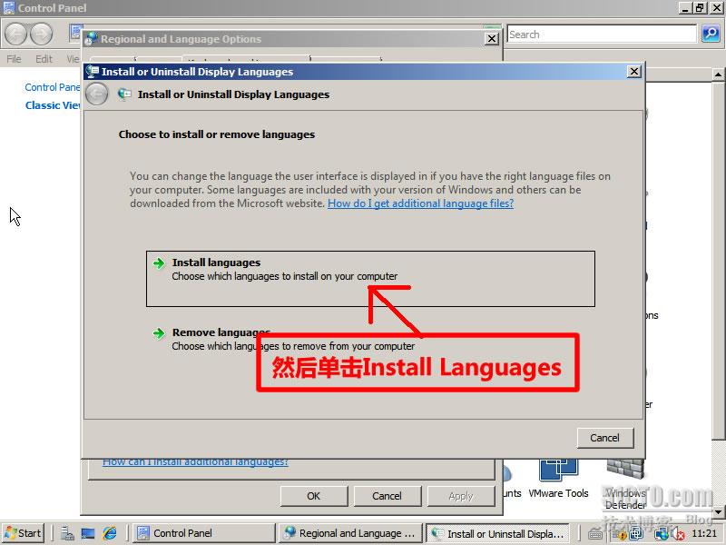 首先在弹出的Regional and Language Options对话框中单击Keyboards and Language选项卡,如图三所示。其次单击Keyboards and Language选项卡内Display Language选项区域里的Install/uninstall Language按钮,如图四所示。然后在弹出的Install or Uninstall Language对话框中单击Install Language选项,如图五所示。