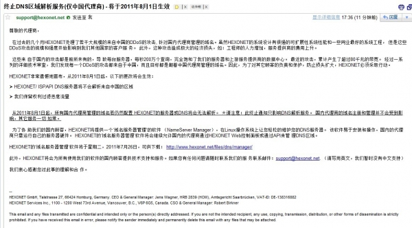 从2011年8月1日起,所有国内代理商管理的域名若仍然配置 HEXONET的服务器或DNS将会无法解析。 *请注意:此终止通知只影响DNS解析服务。国内代理商的域名注册和管理并不会受到影响,其它服务一切如常。