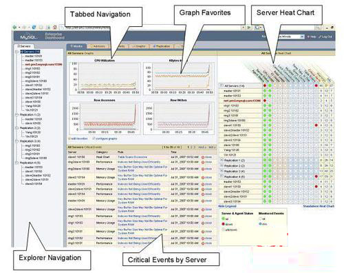 07年9月份推出的企业监控器Fall 2007的组成包括:一个服务代理,每一个被监控的MySQL服务器都需要安装它;还有一个服务管理器,它通过使用Windows或Unix服务器上的一个Java服务来从其监控范围之内的每一个MySQL服务器上收集MySQL和操作系统的数据;一个MySQL数据库作为一个信息仓库,被服务管理器用来显示和报告服务器健康状况。