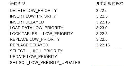 此调度修饰符并非出现在所有MySQL版本中。下面的表列出了这些修饰符和支持这些修饰符的MySQL版本。可利用此表来判断所使用的MySQL版本具有什么样的功能: