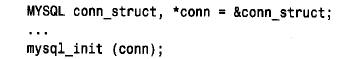 我们已经通过传递NULL 参数调用了mysql_ i n i t ( ),这就是让它分配并且初始化MYSQL 结构,然后返回一个指针。另外一种方法是将指针传递到一个已有的MYSQL 结构中。在这种情况下, mysql_init() 会将结构初始化并返回一个指针,而不必自己分配结构。如果要使用第二种方法,则要小心会出现一些微妙的问题。下面的讨论指出了需要注意的一些问题。如果将一个指针传递给mysql_ init( ),它应该实际指向某些东西。看下面的代码段: