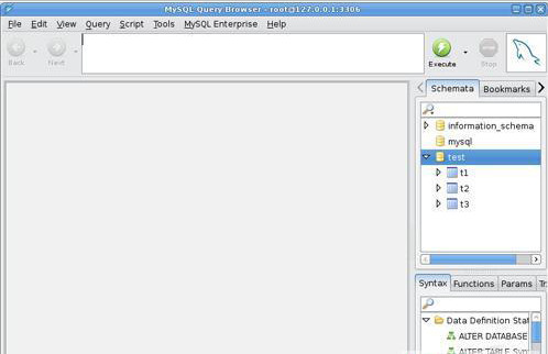 这个Query Browser窗口分为三个不同的区域。右侧的侧边栏分两行包含了几个标签,从这儿你可以查看数据库、书签和历史等,另外,它还提供一个SQL语法的参考部分。在顶部的Query窗口,你可以输入SQL代码。