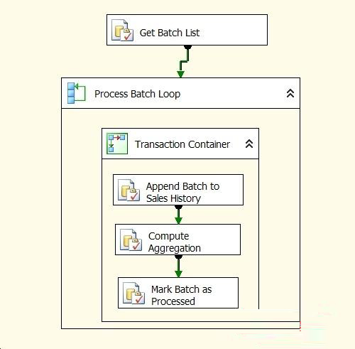 Append Batch to Sales History(附加批处理到销售历史)是一个Execute SQL任务,它提取一批记录并将它们插入到一个历史表中。