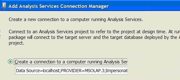 添加一个连接管理(Connection Manager)到SSAS服务器中。右键点击连接管理(Connection Managers)页面,从下拉菜单中选择新的分析服务连接(New Analysis Services Connection)。在对话框中接受默认值以连接到本地SSAS服务器(如果你想连接到其他机器上的SSAS服务器上,你可以酌情编辑)。