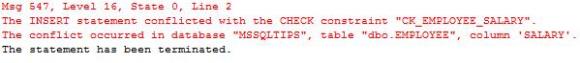 尝试把值插入到SALARY字段超出了我们定义的范围,这也被我们的数据库引擎成功捕捉到了。