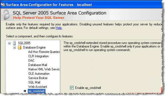 选择功能中的Surface Area Configuration并检查Enable xp_cmdshell检验栏。
