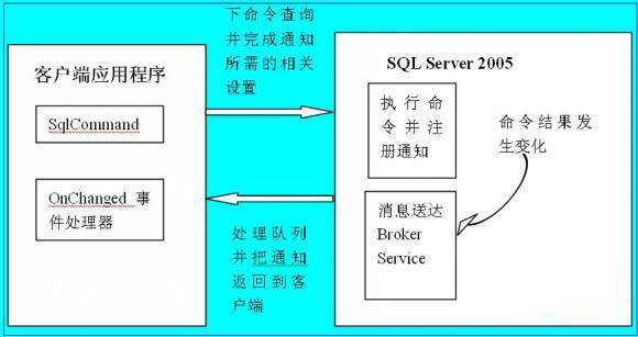 在SQL Server 2005中引入的一种新特征“Service Broker”使得查询通知成为可能。Service Broker把队列机制引入到数据库管理中,它使用一组队列与服务进行通讯,而服务反过来也知道如何往回通讯以调用相应的实体。其实,这些队列和服务都是一些与表、视图和存储过程一样的类对象。尽管完全可以在SQL Server内使用Service Broker,但是ADO.NET也知道如何与Service Broker进行通讯以触发这种机制并且从Service Broker中检索回通知。